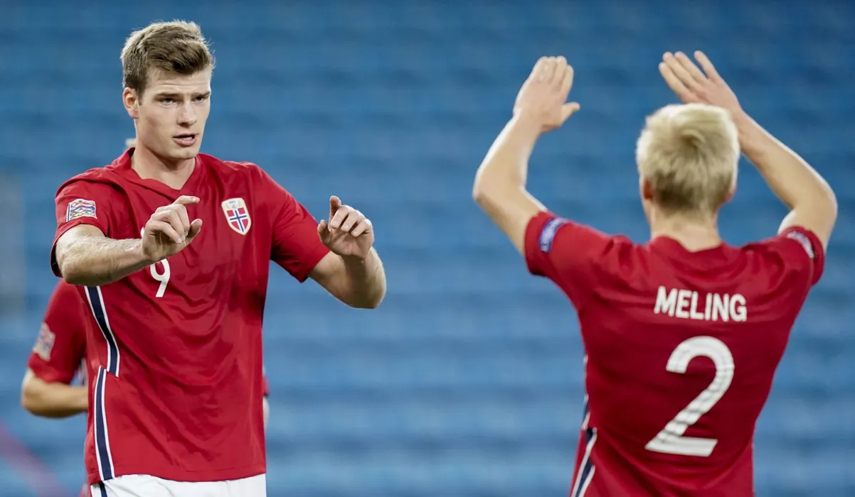 11 October 2020, Norway, Oslo: Norway's Alexander Sorloth celebrates scoring his side's second goal with teammate Birger Meling during the UEFA Nations League Group 1, League B soccer match between Norway and Romania at Ullevaal Stadium. Photo: : Stian Lysberg Solum/NTB/dpa/Hepta/Sport Pictures