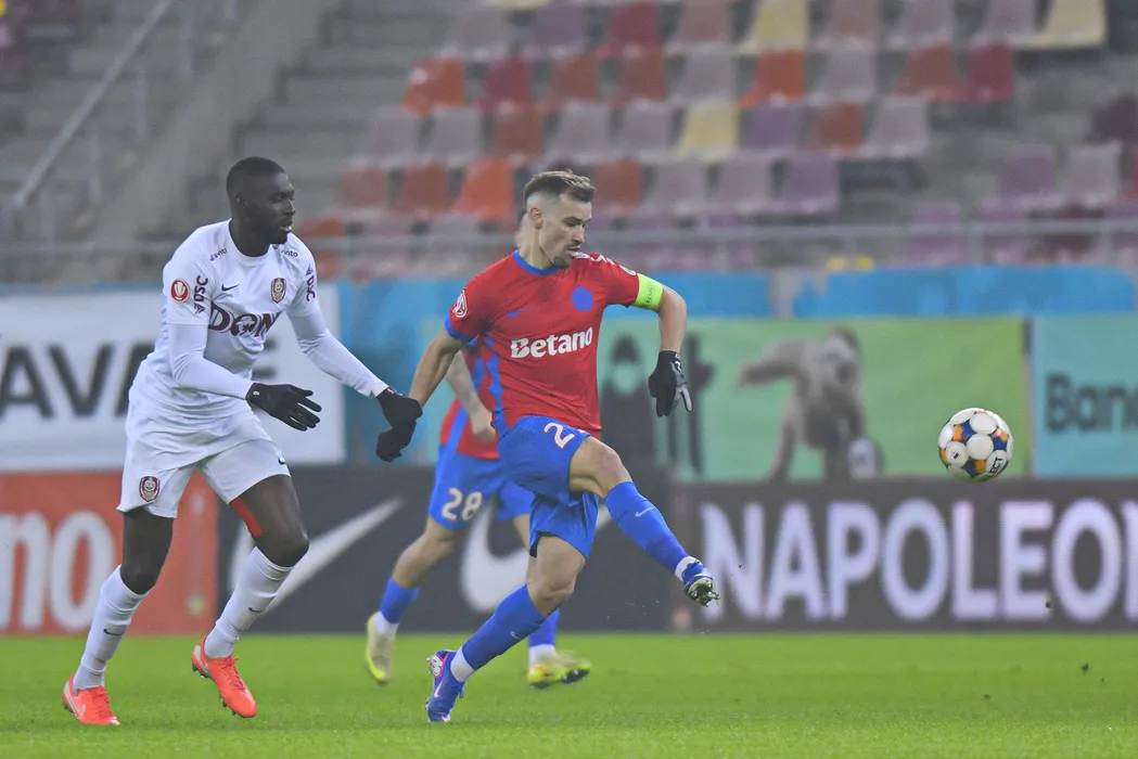 Darius Olaru (D), de la FCSB, suteaza in timpul meciului de fotbal contra echipei CFR Cluj, din etapa a XXIII-a a Superligii, disputat pe Arena Nationala din Bucuresti, duminica, 25 ianuarie 2026. ALEXANDRU DOBRE / MEDIAFAX FOTO