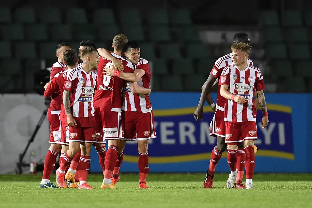 Jucatorii formatiei Sepsi OSK reactioneaza dupa ce au inscris un gol in timpul meciului de fotbal contra echipei FCSB din etapa 8 a play-off-ului Ligii 1, disputat pe stadionul Municipal din Sfantu Gheorghe, duminica, 16 mai 2021. ALEX NICODIM / MEDIAFAX FOTO