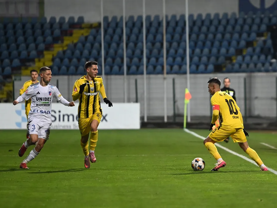 Catalin Ionut Cirjan, Adrian Iulian Caragea si Michael Pavlovic in meciul de fotbal dintre FC Botosani si Dinamo Bucuresti, contand pentru Superliga Superbet, desfasurat pe Stadionul Municipal din Botosani, luni 24 noiembrie 2025. © FOTO:Tudy/SPORT PICTURES