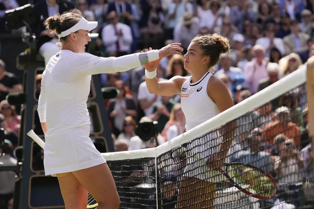 Barbora Krejcikova, left, of the Czech Republic is congratulated by Jasmine Paolini of Italy after winning the women's singles final at the Wimbledon tennis championships in London, Saturday, July 13, 2024.,Image: 889492355, License: Rights-managed, Restrictions: This content is intended for editorial use only. For other uses, additional clearances may be required., Model Release: no, Pictured: Barbora Krejcikova,Jasmine Paolini