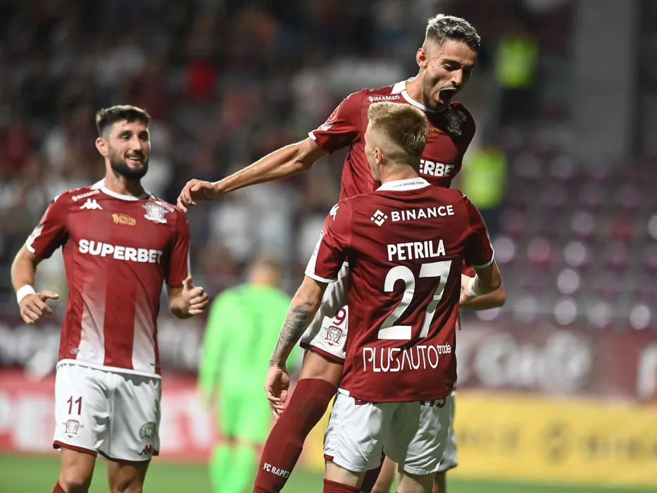 Claudiu Adrian Mihai Petrila se bucura dupa un gol marcat alaturi de Albion Rrahmani in meciul de fotbal dintre Rapid Bucuresti si Dinamo Bucuresti, din cadrul Superligii Superbet, desfasurat pe Superbet Arena-Giulesti din Bucuresti, vineri 1 septembrie 2023. © FOTO:Razvan Pasarica/SPORT PICTURES