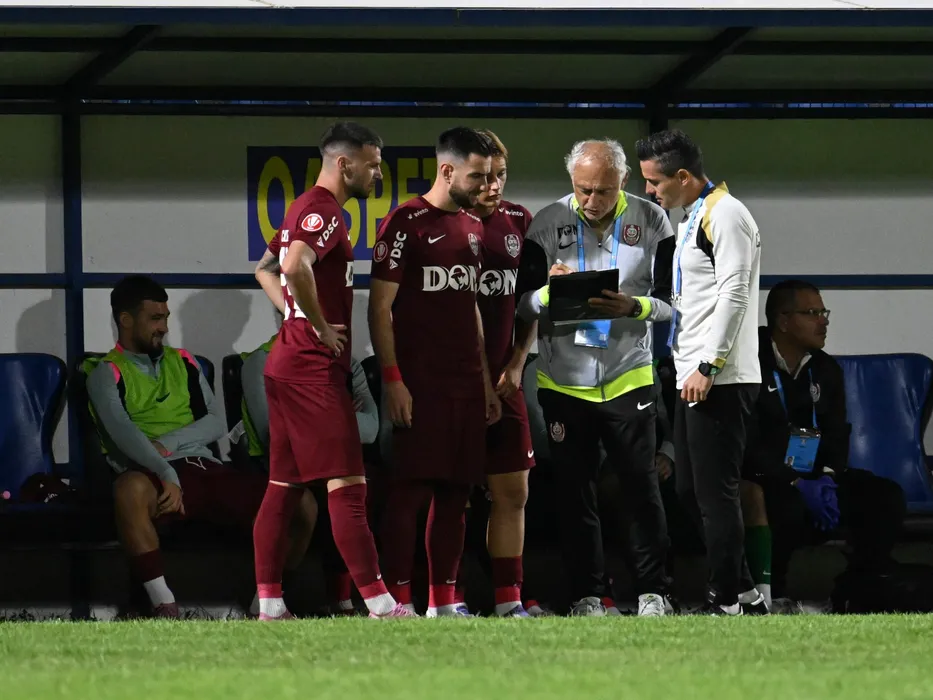 Andrei Ioan Cordea, Constantin Adrian Păun, Lorenzo Biliboc, Andrea Mandorlini si Laurentiu Daniel Rus la schimbare in meciul de fotbal dintre Metaloglobus Bucuresti si CFR Cluj, contand pentru Superliga Superbet, desfasurat pe Clinceni Arena din Clinceni, sambata 13 septembrie 2025. © FOTO:Razvan Pasarica/SPORT PICTURES