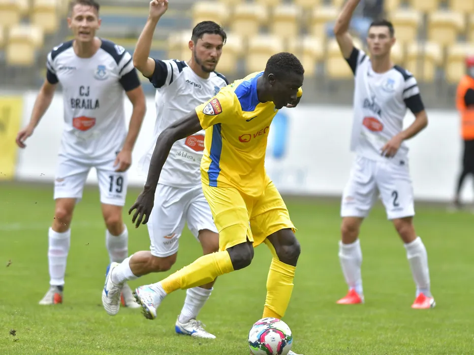 Sory Ibrahim Diarra marcheaza al doilea sau gol in meciul de fotbal dintre Petrolul Ploiesti si Dacia Unirea Braila, contand pentru Liga a-2-a Casa Pariurilor, desfasurat pe Stadionul Ilie Oana din Ploiesti, sambata 28 august 2021. © FOTO:Razvan Pasarica/SPORT PICTURES