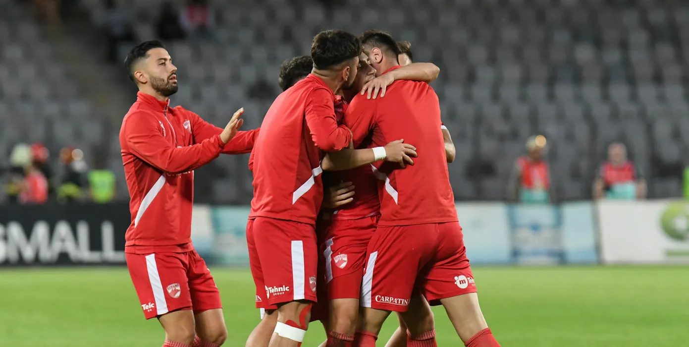 Andrei Ahmed Mustafa Bani felicitat de colegii de pe bancă după un gol marcat în meciul de fotbal dintre FC Universitatea Cluj și Dinamo București contând pentru Superliga Superbet Play-Out, desfășurat pe Stadionul CLUJ ARENA din Cluj-Napoca, sâmbătă 4 mai 2024. © FOTO: Flaviu BUBOI/SPORT PICTURES