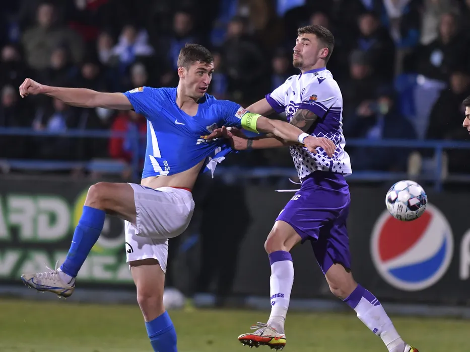 Ionut Justinian Larie si Grigore Ioan Turda in meciul de fotbal dintre Farul Constanta si FC Arges, contand pentru Liga 1 Casa Pariurilor, desfasurat pe Stadionul central al Academiei Gheorghe Hagi din Ovidiu, luni 21 februarie 2022. © FOTO:Razvan Pasarica/SPORT PICTURES