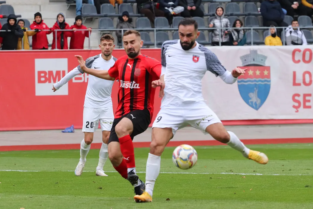 Valmir Berisha șutează de lângă Sergiu Rimovecz și înscrie golul al doilea al echipei din Selimbăr în meciul de fotbal dintre CSC 1599 SELIMBAR și CSM RESITA, contând pentru LIGA 2 CASA PARIURILOR, desfășurat pe Stadionul Municipal din Sibiu, joi 30 noiembrie 2023. © FOTO: Valentin MACREA/SPORT PICTURES