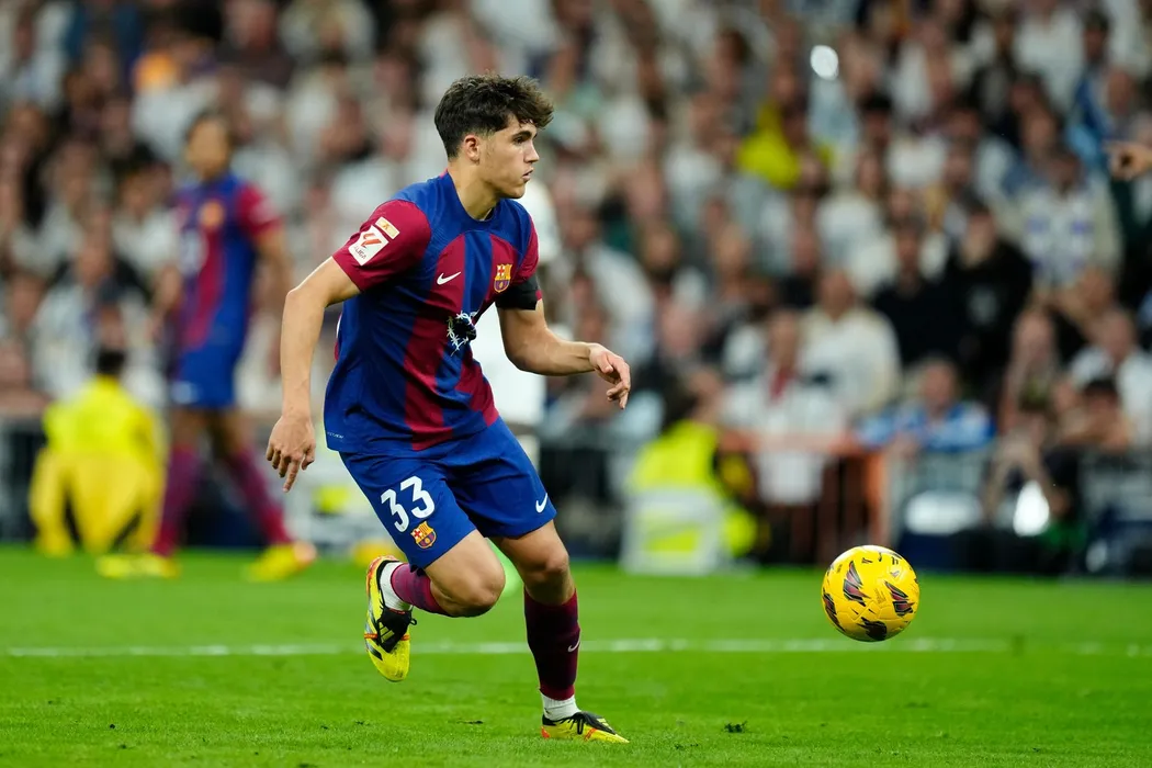 Pau Cubarsi of Barcelona and Spain in action during the LaLiga EA Sports match between Real Madrid CF and FC Barcelona at Estadio Santiago Bernabeu on April 21, 2024 in Madrid, Spain.