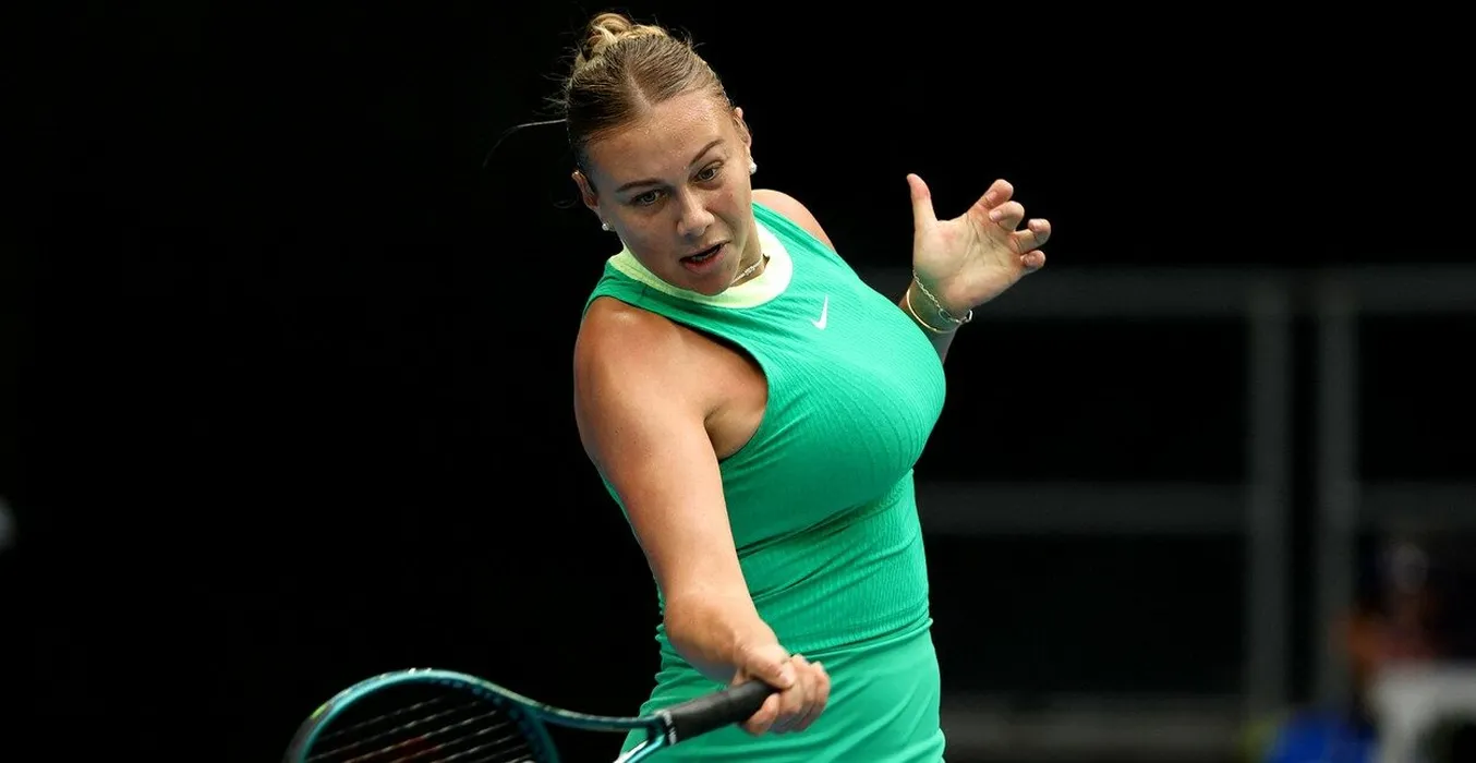 USA's Amanda Anisimova hits a return against Spain's Paula Badosa during their women's singles match on day six of the Australian Open tennis tournament in Melbourne on January 19, 2024.,Image: 838522465, License: Rights-managed, Restrictions: -- IMAGE RESTRICTED TO EDITORIAL USE - STRICTLY NO COMMERCIAL USE --, Model Release: no