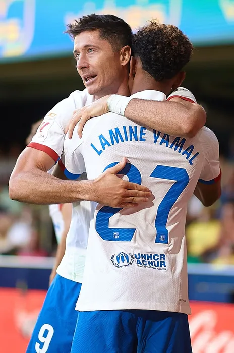 Robert Lewandowski (L) of FC Barcelona celebrates after scoring his side's fourth goal with his teammate Lamine Yamal during the LaLiga EA Sports match between Villarreal CF and FC Barcelona at Estadio de la Ceramica, August 27, 2023, Vila-real, Spain