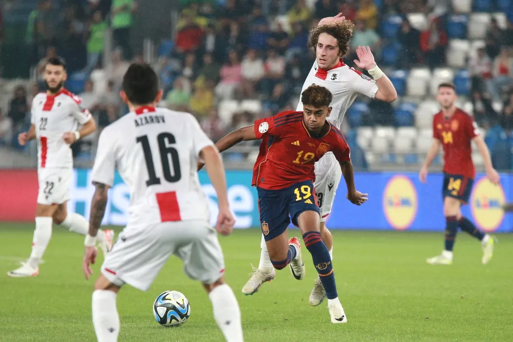 Spain's Lamine Yamal in action during the Euro 2024 group A qualifying soccer match between Georgia and Spain at Boris Paichadze Dinamo Arena in Tbilisi, Georgia, Friday, Sept. 8, 2023.,Image: 803797100, License: Rights-managed, Restrictions: This content is intended for editorial use only. For other uses, additional clearances may be required., Model Release: no