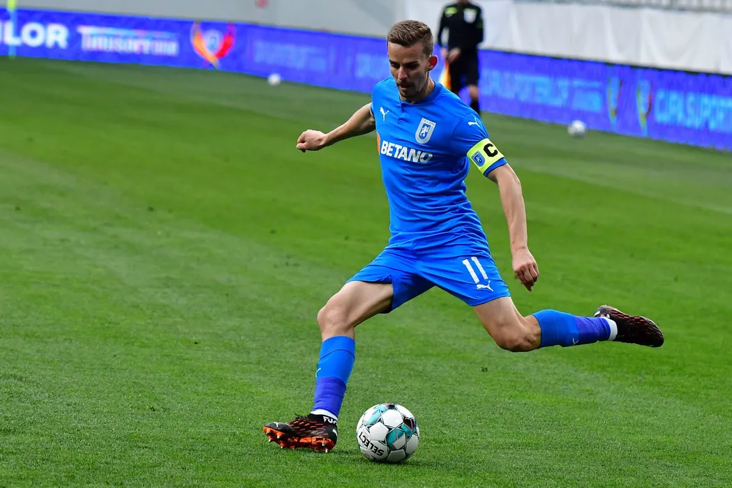 Nicusor Bancu , de la Universitatea Craiova, suteaza in timpul meciului de fotbal contra echipei ACS Viitorul Pandurii Targu Jiu din semifinalele Cupei Romaniei, disputat pe stadionul Ion Oblemenco din Craiova, miercuri, 14 aprilie 2021. REMUS BADEA / MEDIAFAX FOTO