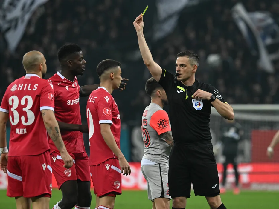 Arbitrul central Florin Andrei acorda un cartonaș galben sub privirile lui Patrick Haakon Olsen, Vhakka Eddy Stelh Gnahore si Catalin Ionut Cirjan in meciul de fotbal dintre Dinamo Bucuresti si FCSB, contand pentru Play off-ul Superligii Superbet, desfasurat pe Arena Nationala din Bucuresti, duminica 30 martie 2025. © FOTO:Razvan Pasarica/SPORT PICTURES
