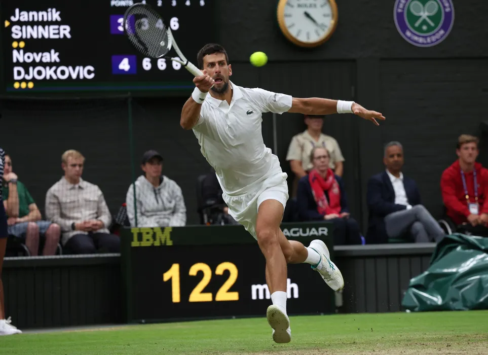 Serbian Novak Djokovic plays a forehand in his Men's semifinals match against Italian Jannik Sinner at the 2023 Wimbledon championships in London on Friday, July 14, 2023.Djokovic won the match 6-3,6-4,7-6. Photo by /UPI,Image: 789121446, License: Rights-managed, Restrictions: , Model Release: no