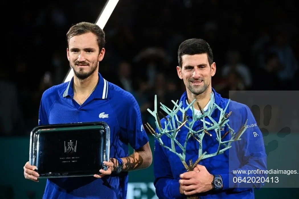 Winner Serbia's Novak Djokovic celebrates with the trophy after winning against Russia's Daniil Medvedev (L) at the end of their their men's single final tennis match on the last day of the ATP Paris Masters at The AccorHotels Arena in Paris on November 7, 2021.,Imagine: 642020413, Licenta: Rights-managed, Restrictii: , Model Release: no, Credit line: Profimedia