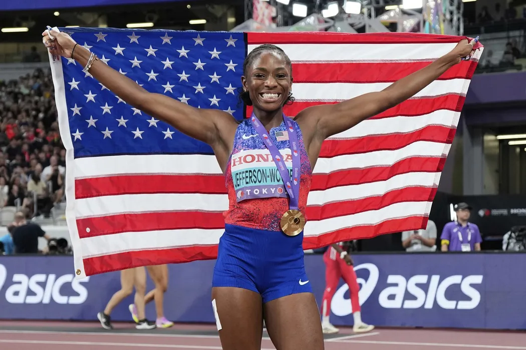 United States' Melissa Jefferson-Wooden reacts after winning the women's 100 meters final at the World Athletics Championships in Tokyo, Sunday, Sept. 14, 2025.,Image: 1037196351, License: Rights-managed, Restrictions: This content is intended for editorial use only. For other uses, additional clearances may be required., Model Release: no, Pictured: Melissa Jefferson-Wooden