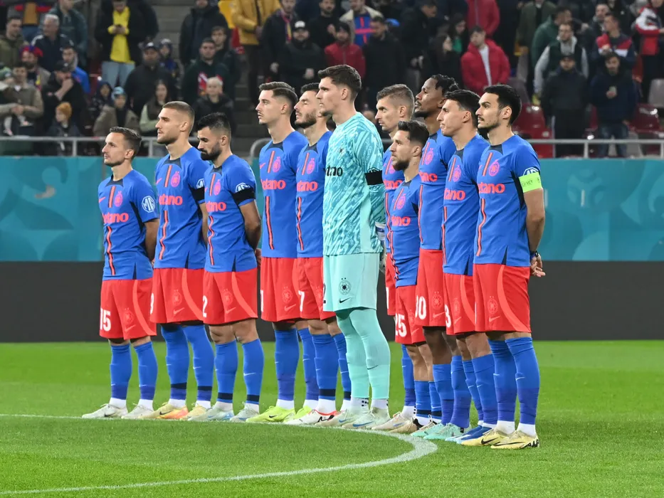 Fotbaliștii steliști la startul meciului de fotbal dintre FCSB si Midtjylland, contand pentru UEFA Europa League, desfasurat pe Arena Nationala din Bucuresti, joi 7 noiembrie 2024. © FOTO:Razvan Pasarica/SPORT PICTURES