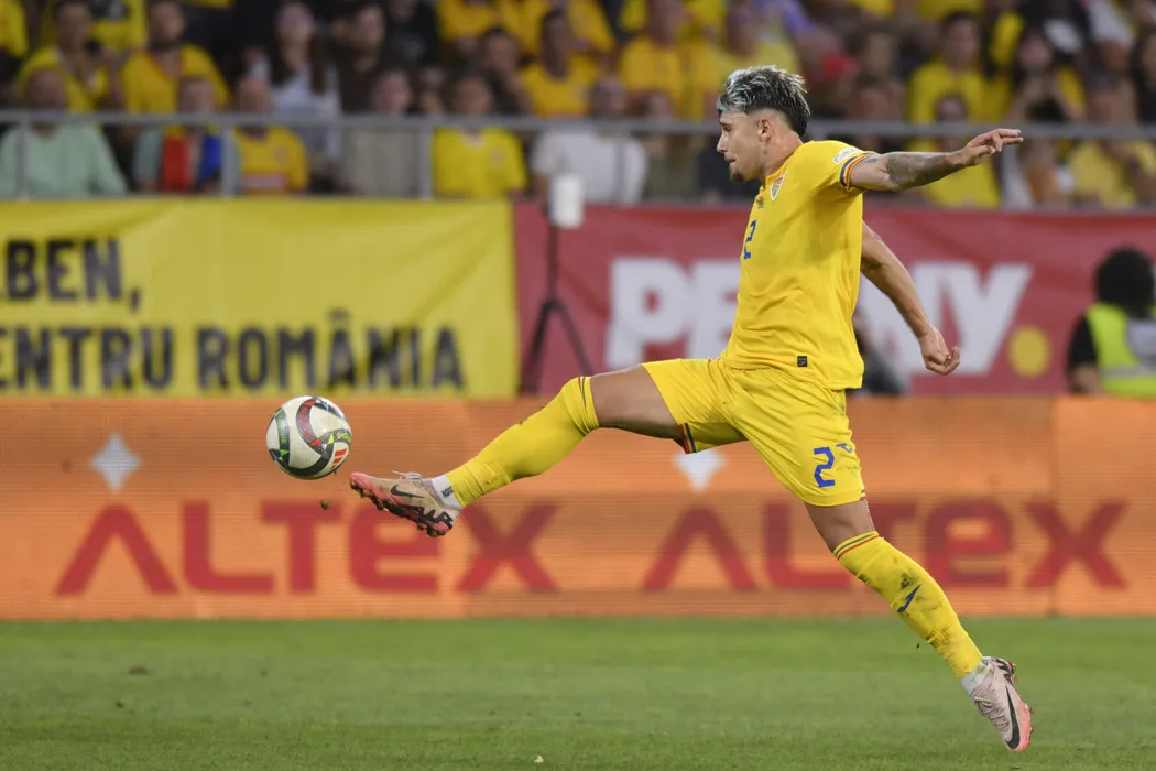 Andrei Ratiu, de la echipa nationala de fotbal a Romaniei, suteaza in timpul meciului contra selectionatei Lituaniei, din etapa a doua a grupelor din Liga Natiunilor, disputat pe stadionul Steaua din Bucuresti, luni, 9 septembrie 2024. ALEXANDRU DOBRE / MEDIAFAX FOTO