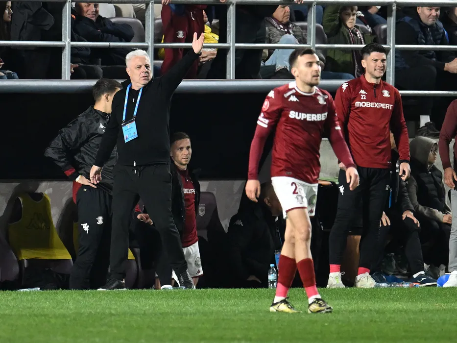 Marius Sumudica reacționează alături de Cristian Ionuț Săpunaru in meciul de fotbal dintre Rapid Bucuresti si FCSB, din cadrul Play off-ului Superligii Superbet, desfasurat pe Superbet Arena Giulesti din Bucuresti, luni 27 aprilie 2025. © FOTO:Razvan Pasarica/SPORT PICTURES