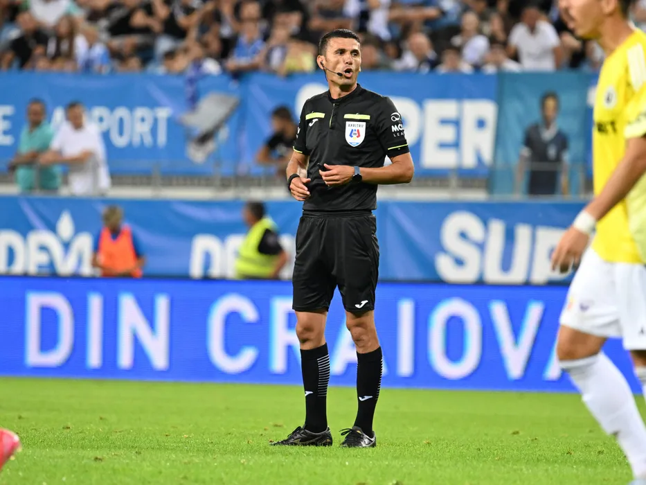 Arbitrul central Marcel Birsan reacționează in meciul dintre Universitatea Craiova si Universitatea Cluj, contand pentru Superliga Superbet, desfasurat pe Stadionul Ion Oblemenco din Craiova, luni 28 iulie 2025. © FOTO:Razvan Pasarica/SPORT PICTURES