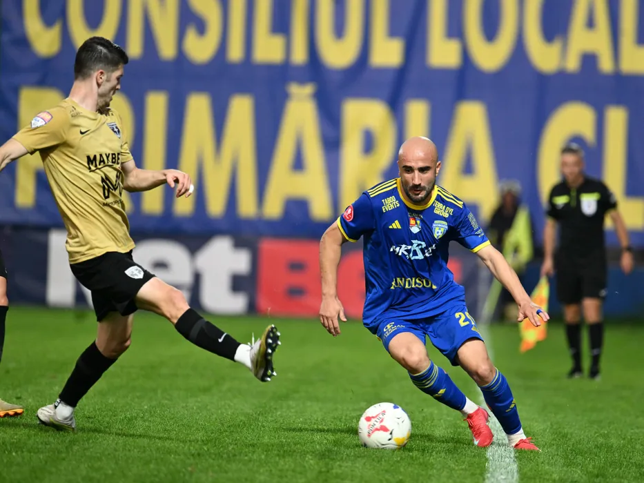 Daniel Alexandru Git si Daniel Marius Serbanica in meciul de fotbal dintre Unirea Slobozia si FC Voluntari, barajul retur pentru mentinere/promovare in Superliga Superbet, desfasurat pe Clinceni Arena din Clinceni, luni 2 iunie 2025. © FOTO:Razvan Pasarica/SPORT PICTURES