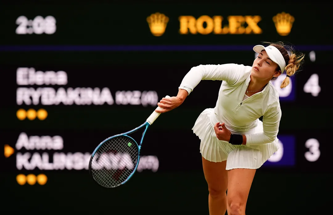 08 July 2024, United Kingdom, London: Russian tennis player Anna Kalinskaya in action against Kazakhstan's Elena Rybakina during their women's singles round of 16 tennis match on day eight of the 2024 Wimbledon Championships at the All England Lawn Tennis and Croquet Club. Photo: Aaron Chown/PA Wire/dpa