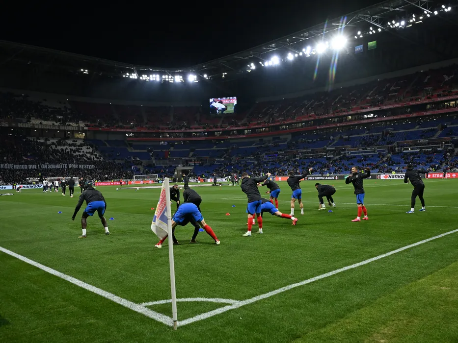 Fotbaliștii ros-albastrii la incalzire inaintea meciului de fotbal dintre Olympique Lyon si FCSB din cadrul UEFA Europa League, desfasurat pe Groupama Arena din Lyon, joi 13 martie 2025. © FOTO:Razvan Pasarica/SPORT PICTURES