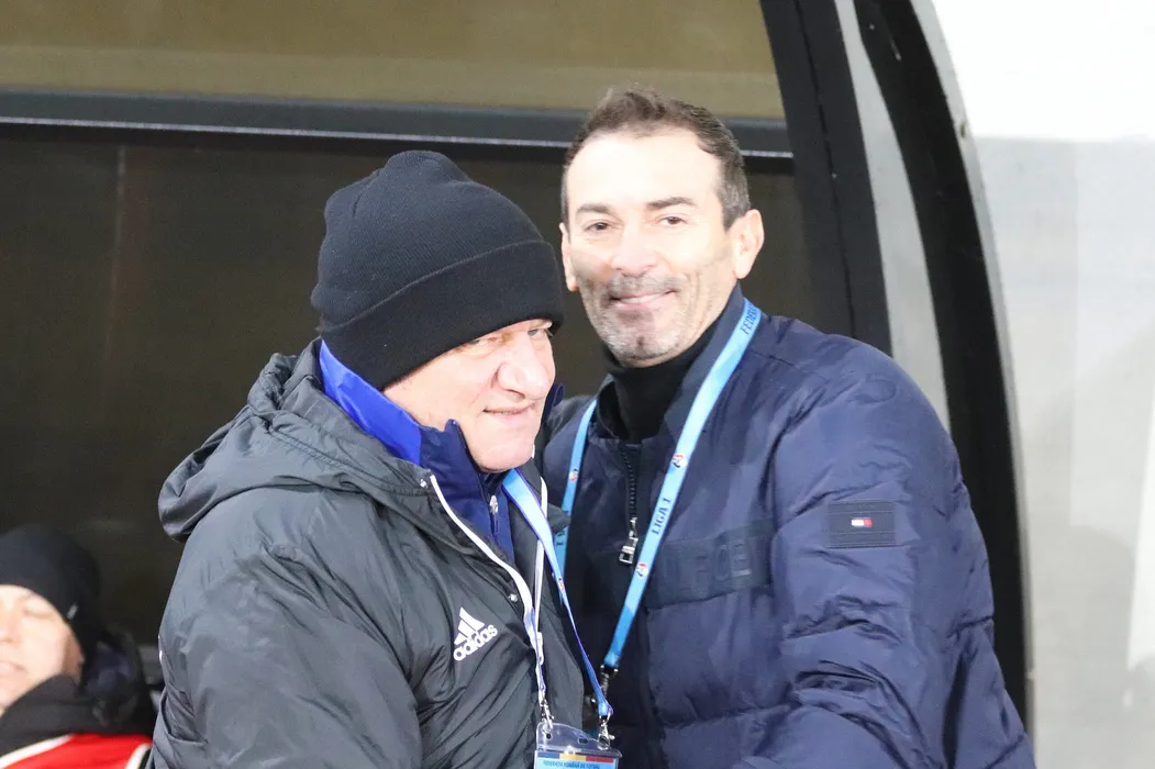 Cei doi antrenori Marius Măldărașanu și Dorinel Ionel Munteanu se salută înaintea meciului de fotbal dintre AFC Hermannstadt Sibiu si SC Oțelul Galați, petru Superliga Superbet, desfășurat pe Stadionul Municipal din Sibiu, luni 9 decembrie 2024. © FOTO: Valentin MACREA/SPORT PICTURES