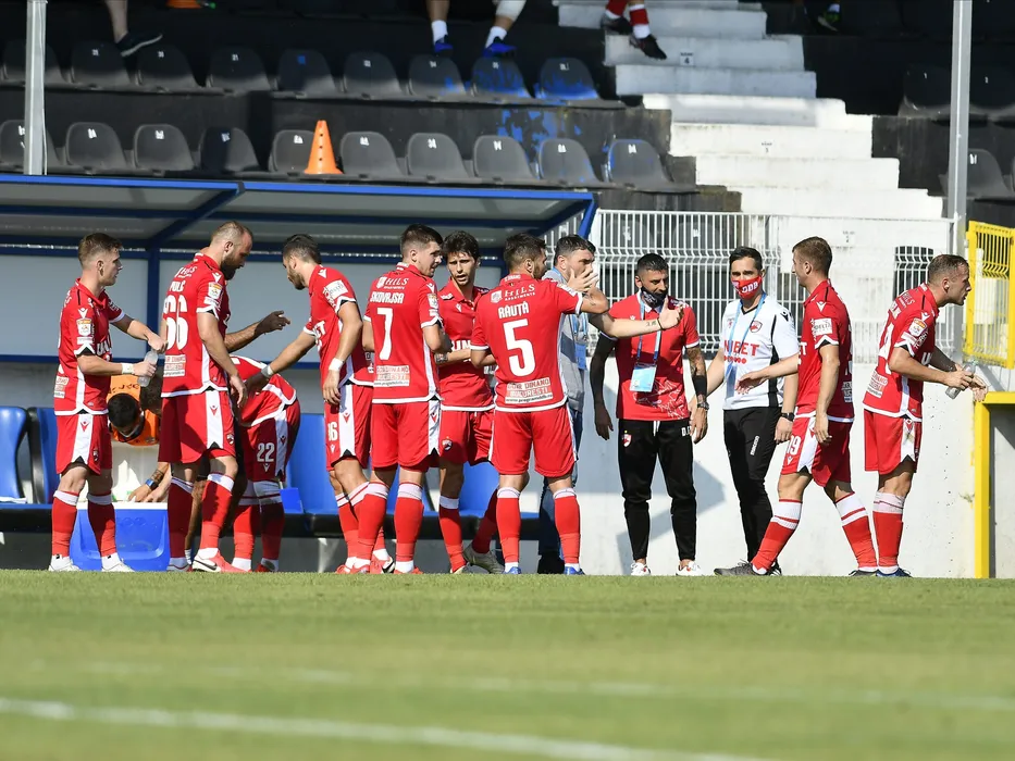 Fotbalistii dinamovisti Valentin Marius Lazar, Ante Puljic, Lukas Skovajsa, Diego Fabbrini, Alexandru Ilie Rauta, Daniel Iliuta Popa si Filip Mrzljak alaturi de Adrian Mihalcea si Ionel Danciulescu la o pauza de hidratare in meciul de fotbal dintre Academica Clinceni si Dinamo Bucuresti, contand pentru play-out-ul Ligii 1 Casa Pariurilor, disputat pe Clinceni Arena din Clinceni, duminica 5 iulie 2020. © FOTO:Razvan Pasarica/SPORT PICTURES