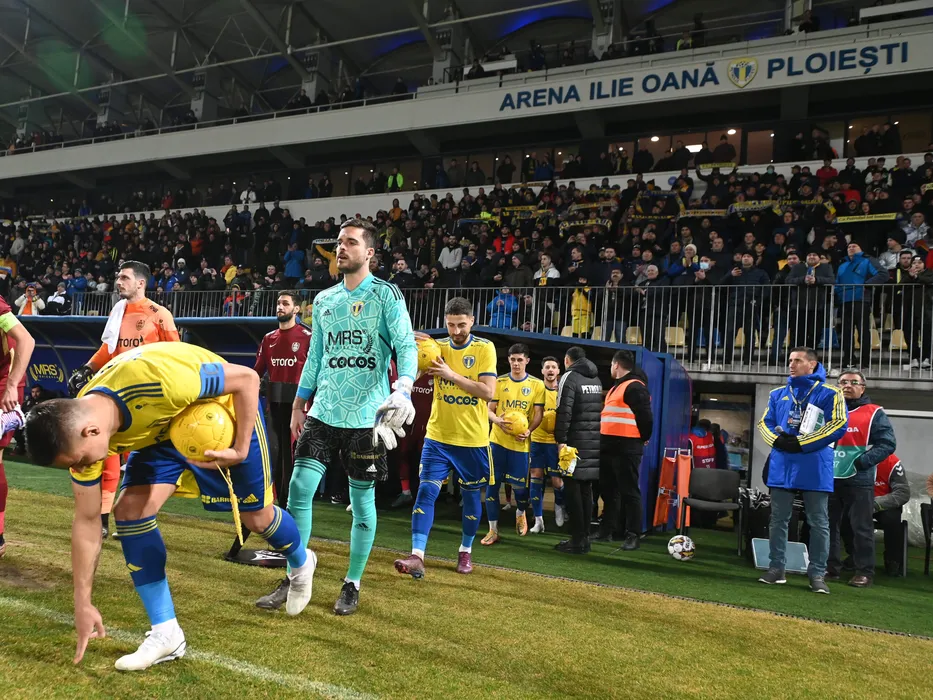 Fotbalistii ploiesteni Marian Fernando Huja, Andreas Leitner si Gheorghe Teodor Grozav la startul meciului de fotbal dintre Petrolul Ploiesti si CFR Cluj, contand pentru Superliga Superbet, desfasurat pe Stadionul Ilie Oana din Ploiesti, luni 27 februarie 2023. © FOTO:Razvan Pasarica/SPORT PICTURES