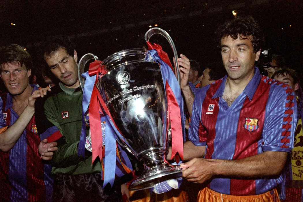*Embargoed until 06:00 - 20 May 2020* File photo dated 20-05-1992 of Michael Laudrup, Andoni Zubizarreta, and Juan Antonio Goicoechea of Barcelona celebrate their European Cup victory over Sampdoria at Wembley.,Image: 520595030, License: Rights-managed, Restrictions: FILE PHOTO, Model Release: no, Credit line: John Stillwell / PA Images / Profimedia