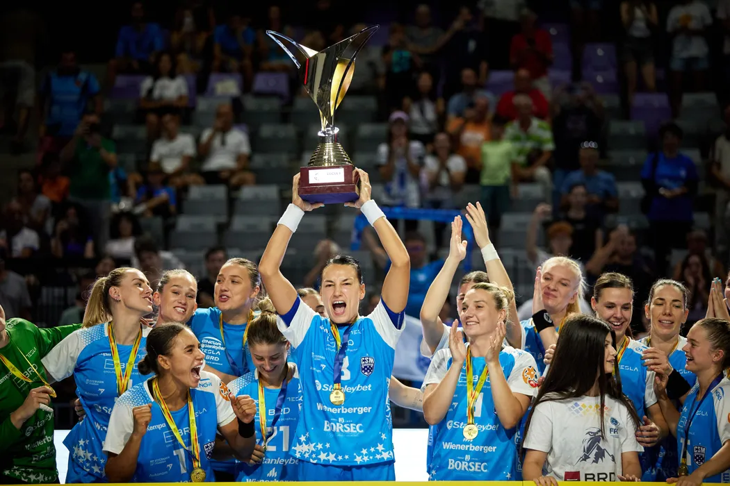 Cristina Georgiana Neagu ridică trofeul SuperCupa României în uralele colegelor după meciul de handbal dintre CS Gloria 2018 Bistrița-Năsăud și CSM București, contând pentru Supercupa Romaniei Feminin 24-25 - Finala, desfășurat în Sala Polivalentă Pitești-Arena din Pitești, vineri 23 august 2024. © FOTO: Sabin MALISEVSCHI/SPORT PICTURES