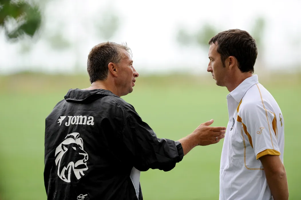 Antrenorul echipei de fotbal Unirea Urziceni, Dan Petrescu (S), discuta cu managerul Mihai Stoica (D), in Urziceni, marti, 30 iunie 2009. BOGDAN STAMATIN / MEDIAFAX FOTO