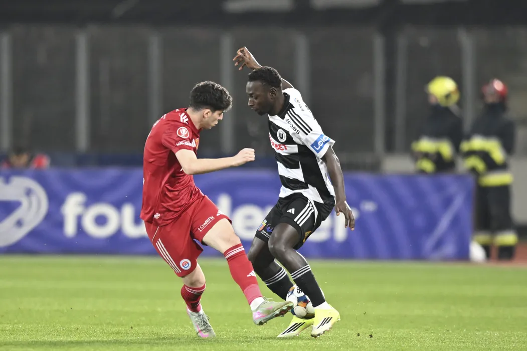 N'Dayanthane Mendy Oucasse si Stefan Daniel Bana in meciul de fotbal dintre FC Universitatea Cluj si SC Otelul Galati, contand pentru Superliga Superbet, desfasurat pe Cluj Arena din Cluj-Napoca, vineri 27 februarie 2026. © FOTO:Flaviu Buboi/SPORT PICTURES