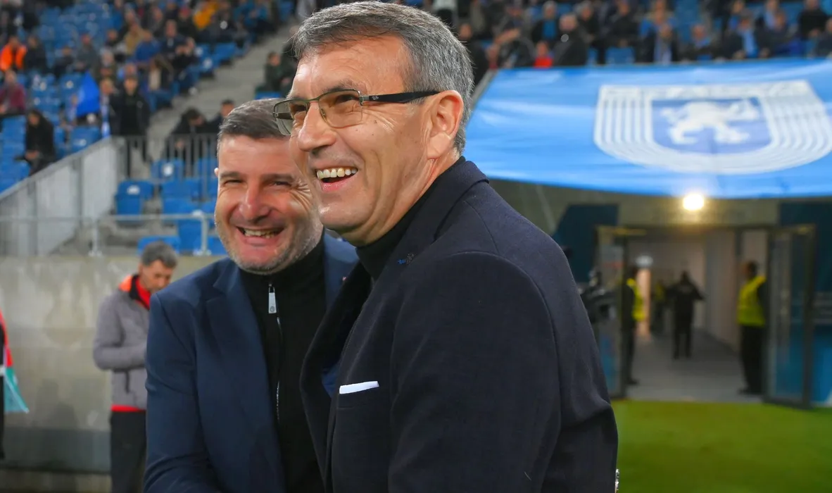 Cei doi antrenori Eugen Neagoe si Laszlo Gyorgy Balint se saluta inaintea meciului de fotbal dintre Universitatea Craiova si UTA Arad, contand pentru Superliga Superbet, desfasurat pe Stadionul Ion Oblemenco din Craiova, vineri 10 martie 2023. © FOTO:Razvan Pasarica/SPORT PICTURES