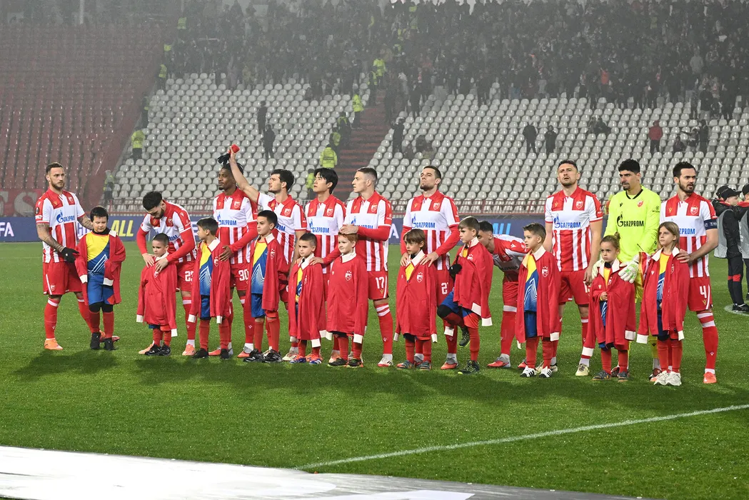 Fotbalistii sarbi la startul meciului de fotbal dintre Steaua Rosie Belgrad si FCSB, din cadrul UEFA Europa League, desfasurat pe Stadionul Rajko Mitić din Belgrad, joi 27 noiembrie 2025. © FOTO:Razvan Pasarica/SPORT PICTURES