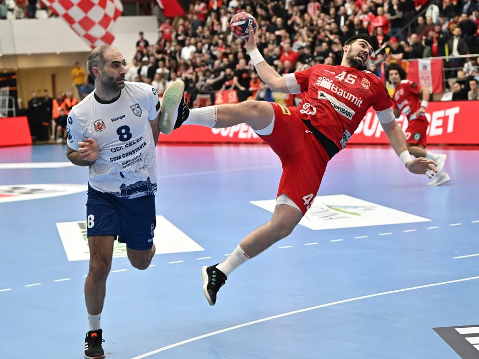 Irakli Chikovani si Rosta Miklos in meciul de handbal masculin dintre Dinamo Bucuresti si CSM Constanta, din cadrul EHF European League, desfasurat in Sala Dinamo din Bucuresti, marti 20 februarie 2024. © FOTO:Razvan Pasarica/SPORT PICTURES