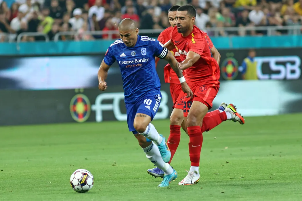 Juan Francisco Bauza (S), de la FC U Craiova, lupta pentru balon cu Rachid Bouhenna (D), de la FCSB, in meciul de fotbal din etapa a III-a a Superligii, disputat pe Arena Nationala din Bucuresti, duminica, 31 iulie 2022. GEORGE FILIP / MEDIAFAX FOTO
