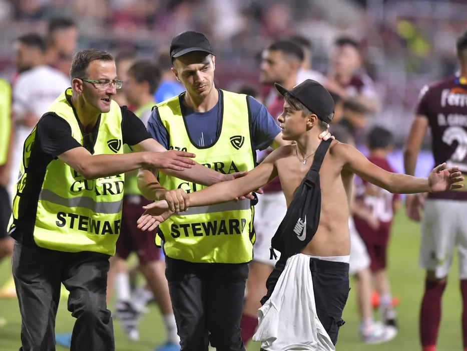 Un tanar suporter rapidist este evacuat de pe teren de fortele de ordine dupa meciul de fotbal dintre Rapid Bucuresti si UTA Arad, contand pentru Superliga Superbet, desfasurat pe Stadionul Rapid Giulesti din Bucuresti, sambata 20 august 2022. © FOTO:Razvan Pasarica/SPORT PICTURES