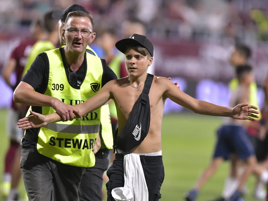Un tanar suporter rapidist este evacuat de pe teren de fortele de ordine dupa meciul de fotbal dintre Rapid Bucuresti si UTA Arad, contand pentru Superliga Superbet, desfasurat pe Stadionul Rapid Giulesti din Bucuresti, sambata 20 august 2022. © FOTO:Razvan Pasarica/SPORT PICTURES