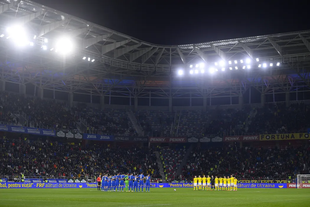Reprezentativele nationale de fotbal ale Romaniei (echipament alb-galben) si Greciei asculta intonarea imnurilor nationale, inaintea inceperii unei partide amicale, vineri, 25 martie 2022, pe stadionul Steaua din Bucuresti. ALEX NICODIM / MEDIAFAX FOTO