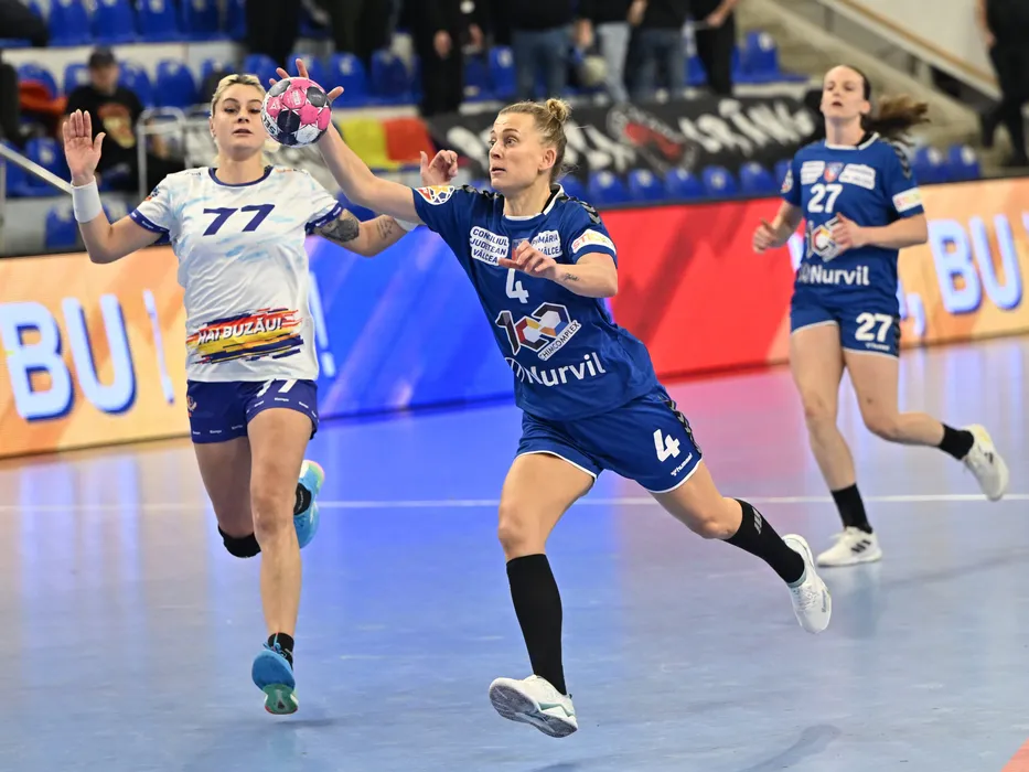 Ana Maria Iuganu si Nathalie Mari Hagman in meciul de handbal feminin dintre SCM Gloria Buzau si SCM Ramnicu Valcea, contand pentru Liga Florilor, desfasurat in Sala Sporturilor Romeo Iamandi din Buzau, joi 8 februarie 2024. © FOTO:Razvan Pasarica/SPORT PICTURES
