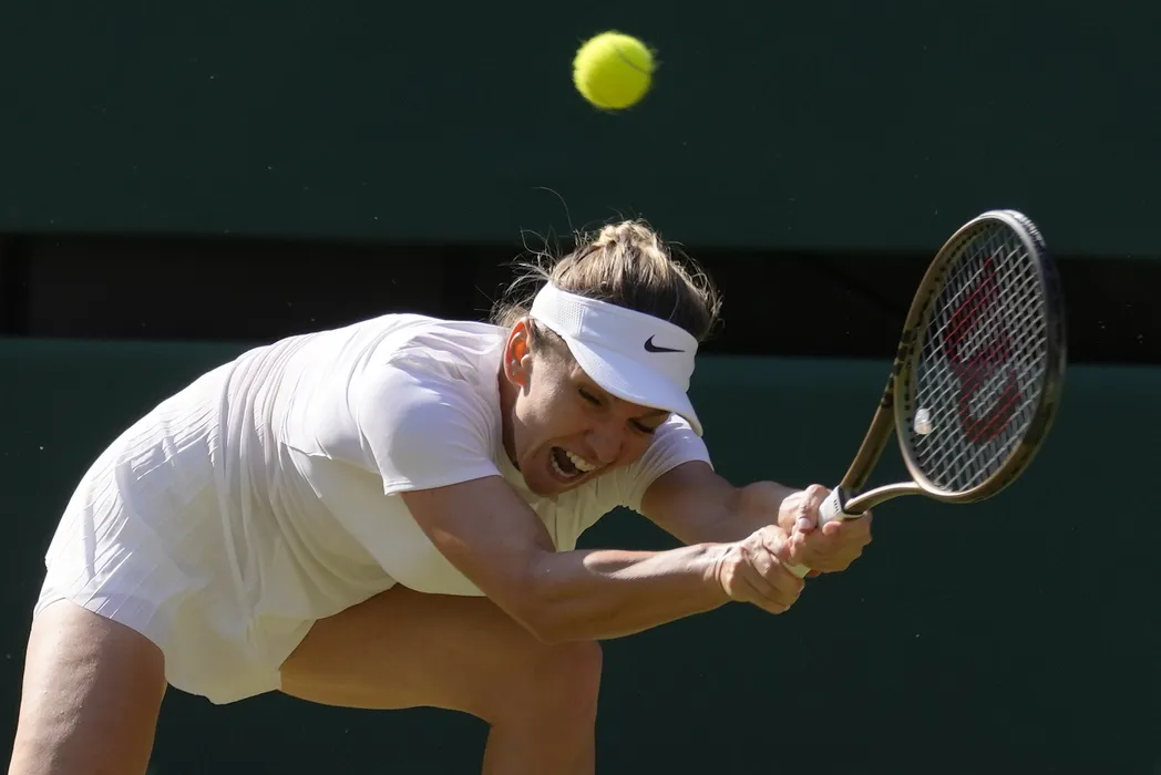Romania's Simona Halep returns to Kazakhstan's Elena Rybakina in a women's singles semifinal match on day eleven of the Wimbledon tennis championships in London, Thursday, July 7, 2022. (AP Photo/Kirsty Wigglesworth)