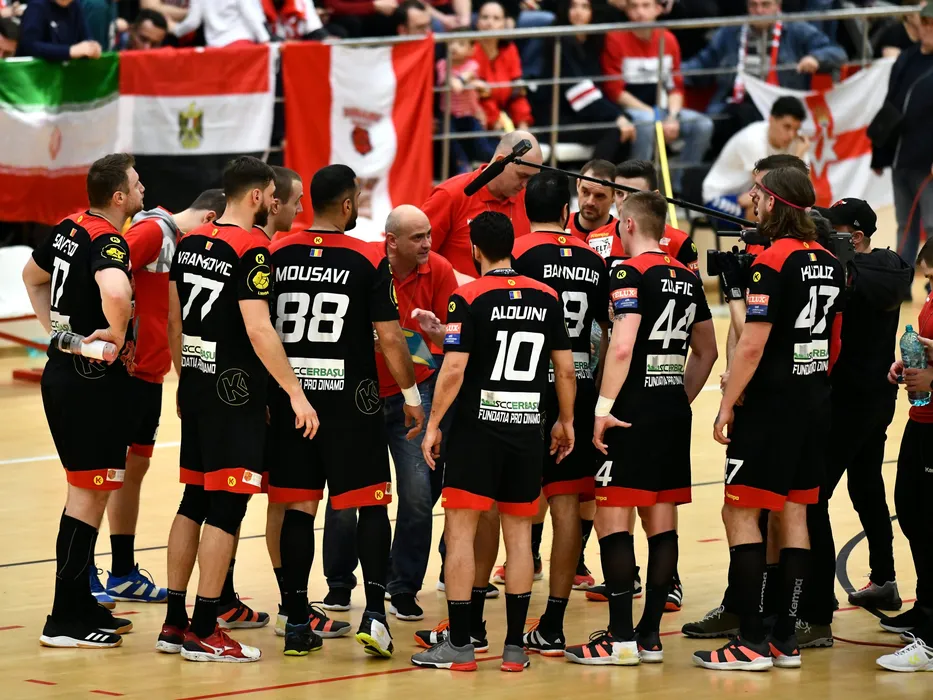 Stefan Constantin la un timeout alaturi de elevii sai Jakov Vrankovic si Razvan Gavriloaia in meciul de handbal masculin dintre Dinamo Bucuresti si Steaua Bucuresti, contand pentru Liga Zimbrilor, disputat in Sala Dinamo din Bucuresti, joi 5 martie 2019. © FOTO:Razvan Pasarica/SPORT PICTURES