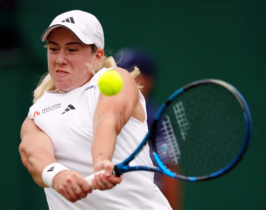 03 July 2024, United Kingdom, London: British tennis player Sonay Kartal in action against France's Clara Burel during their women's singles tennis match of the 2024 Wimbledon Championships at the All England Lawn Tennis and Croquet Club. Photo: Mike Egerton/PA Wire/dpa