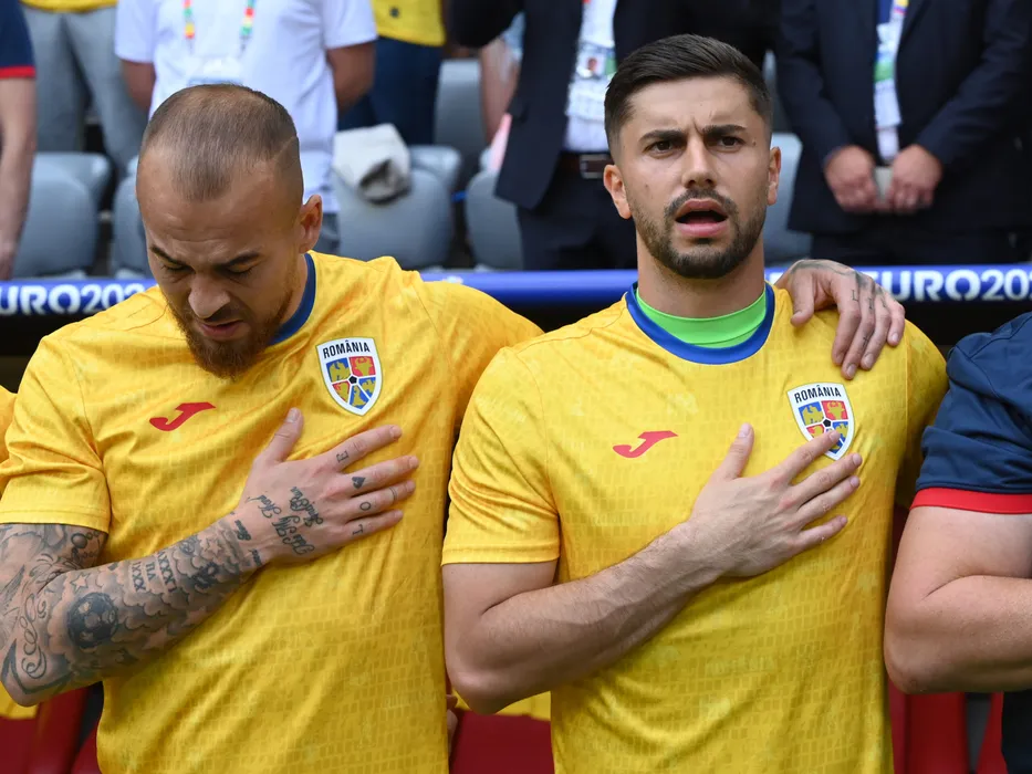 Fotbalistii romani Denis Alibec si Horațiu Moldovan la intonarea imnului inaintea meciul dintre Romania si Ucraina, din cadrul UEFA EURO 2024, desfasurat pe Fussball Arena din Munchen, luni 17 iunie 2024. © FOTO:Razvan Pasarica/SPORT PICTURES
