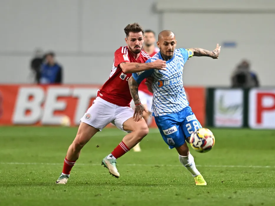 Joao Pedro Santos Lameira si Ionuț Alexandru Mitriță in meciul de fotbal dintre Universitatea Craiova si Otelul Galati, contand pentru Cupa Romaniei Betano, desfasurat pe Stadionul Ion Oblemenco din Craiova, joi 4 aprilie 2024. © FOTO:Razvan Pasarica/SPORT PICTURES