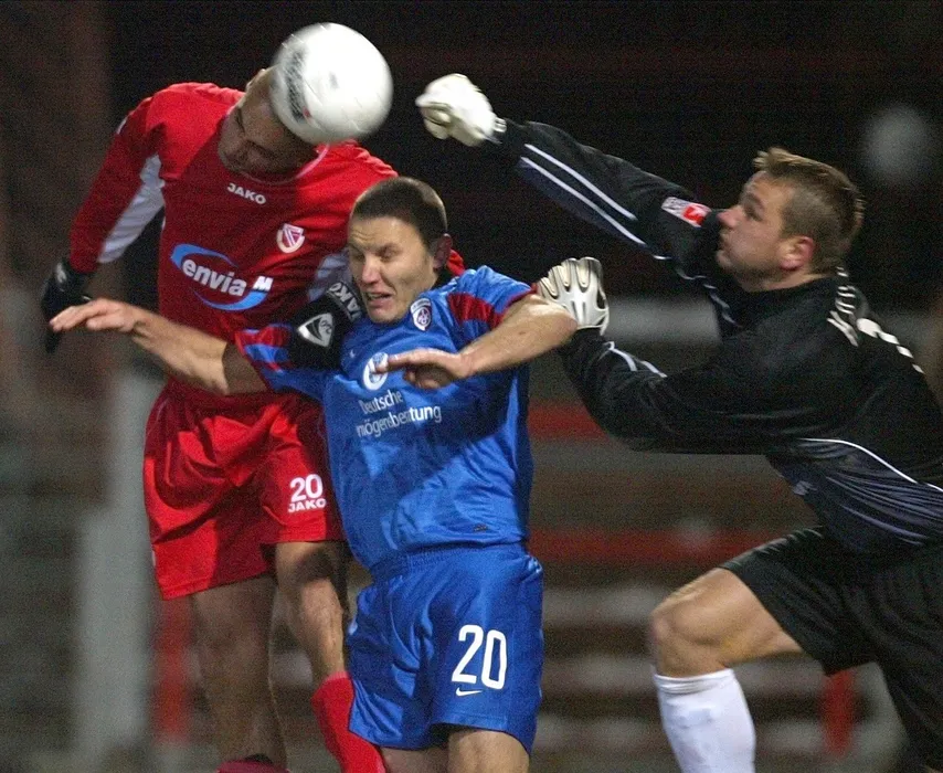 (dpa) - Cottbus' defender Radoslaw Kaluzny (L) fights for the ball with Kaiserslautern's defender Tomasz Klos (C) while Kaiserslautern's goalkeeper Georg Koch tries to clear the ball with his fist, during the second round match for the DFB Cup in Cottbus, Germany, 6 November 2002. Cottbus is defeated 0:1.,Image: 69515493, License: Rights-managed, Restrictions: , Model Release: no