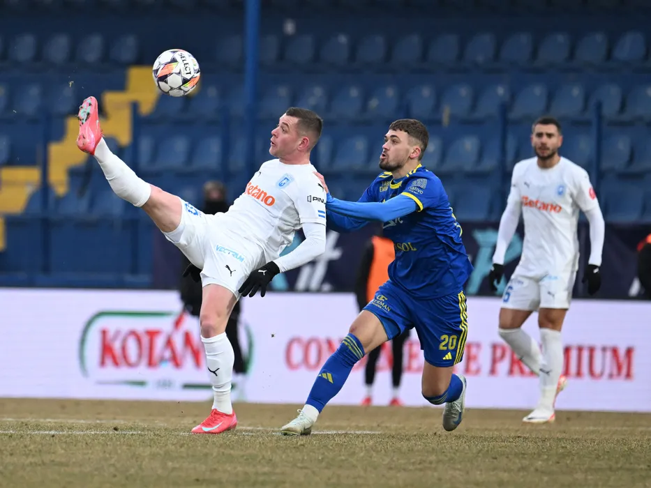 Alexandru Cicaldau si Ovidiu Ioan Perianu in meciul de fotbal dintre Unirea Slobozia si Universitatea Craiova, din cadrul Superligii Superbet, desfasurat pe Clinceni Arena din Clinceni, sambata 8 februarie 2025. © FOTO:Razvan Pasarica/SPORT PICTURES