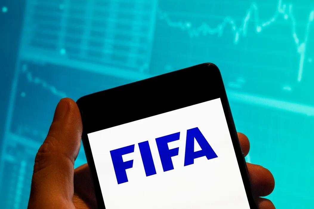 February 15, 2023, China: In this photo illustration, the Fédération Internationale de Football Association (FIFA) logo is seen displayed on a smartphone with an economic stock exchange index graph in the background.,Image: 762170806, License: Rights-managed, Restrictions: , Model Release: no